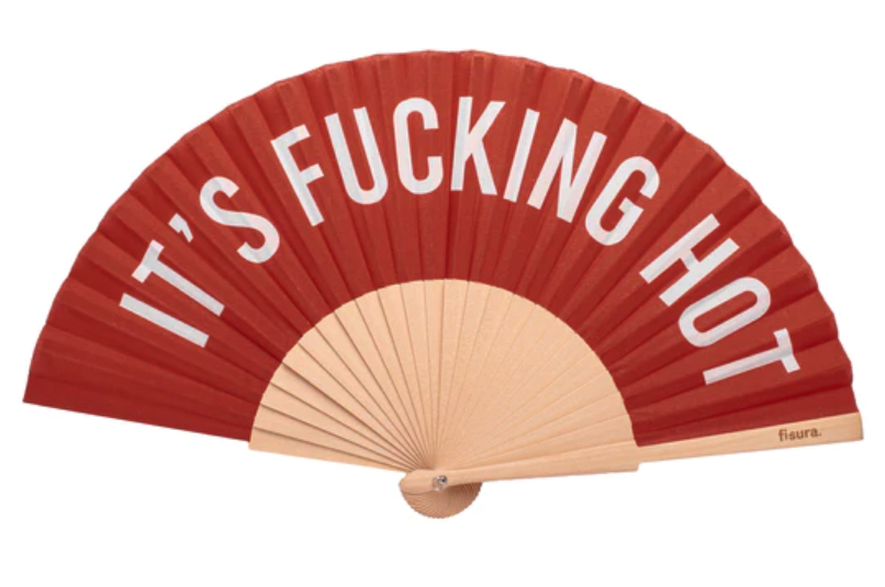 • Leque vermelho com texto branco IT'S FUCKING HOT