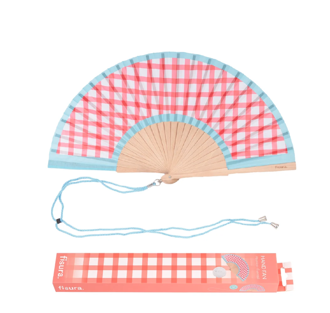 • Leque vermelho e branco com acabamentos azuis claros e embalagem rosa quadriculada