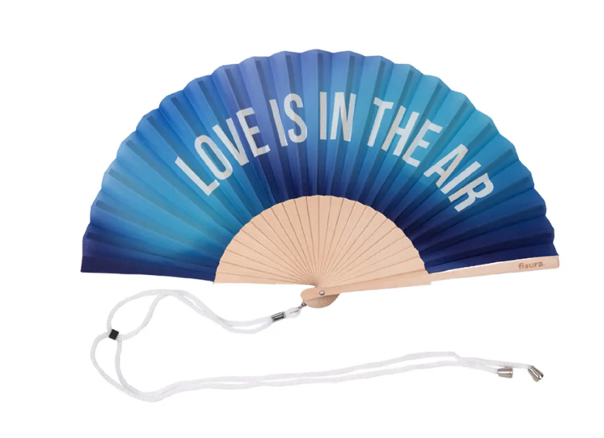 • Leque azul com estrutura em madeira e texto branco 'LOVE IS IN THE AIR'