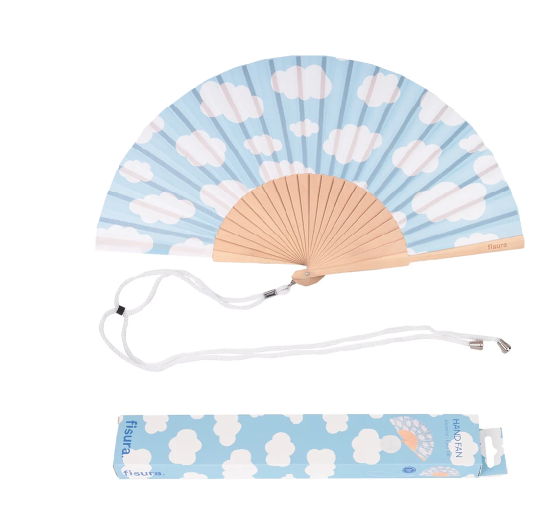 Leque de tecido com padrão de nuvens brancas e estrutura em madeira clara