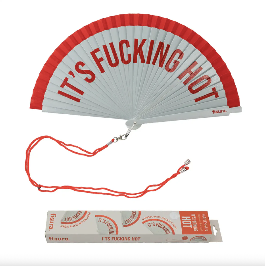 Leque branco e vermelho com frase 'IT'S FUCKING HOT' em letras vermelhas