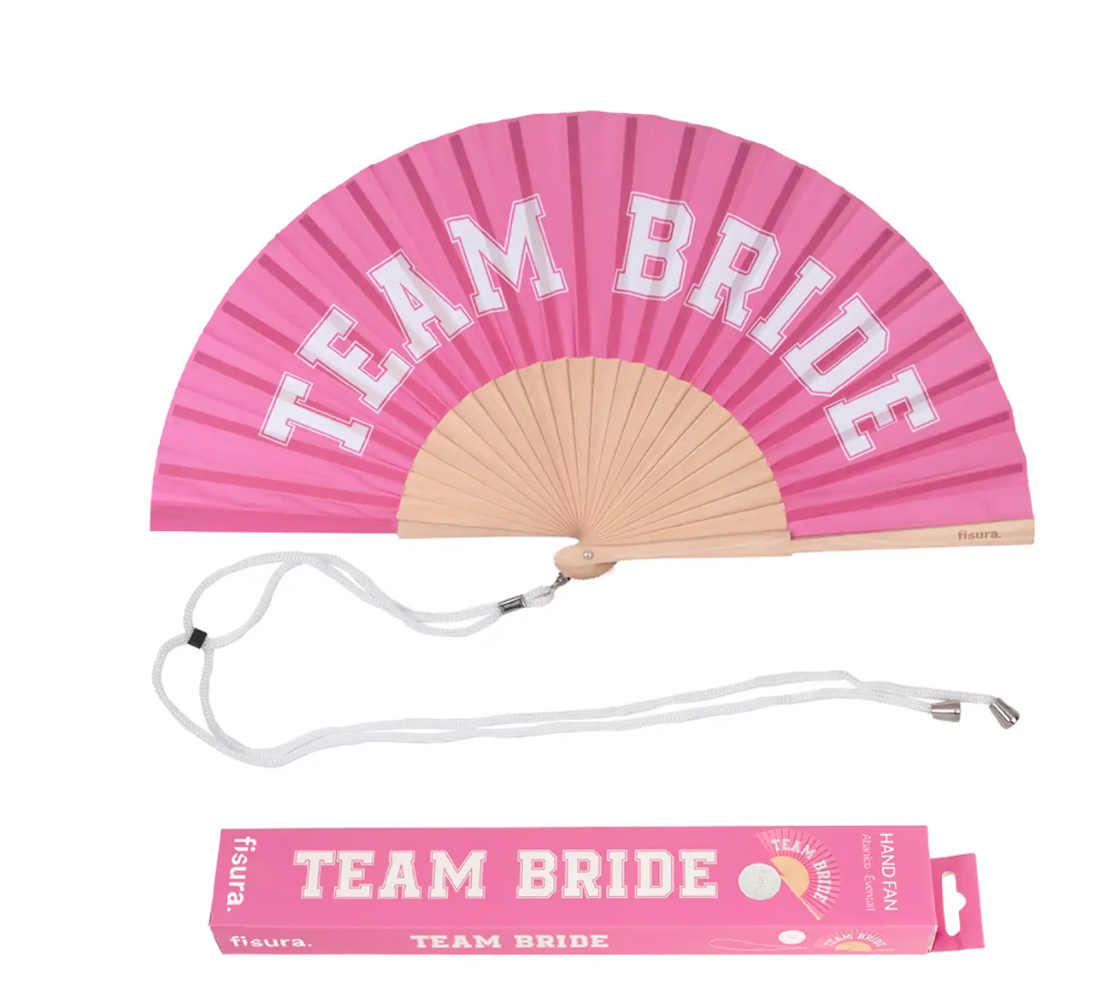 • Leque rosa com texto 'TEAM BRIDE' e embalagem