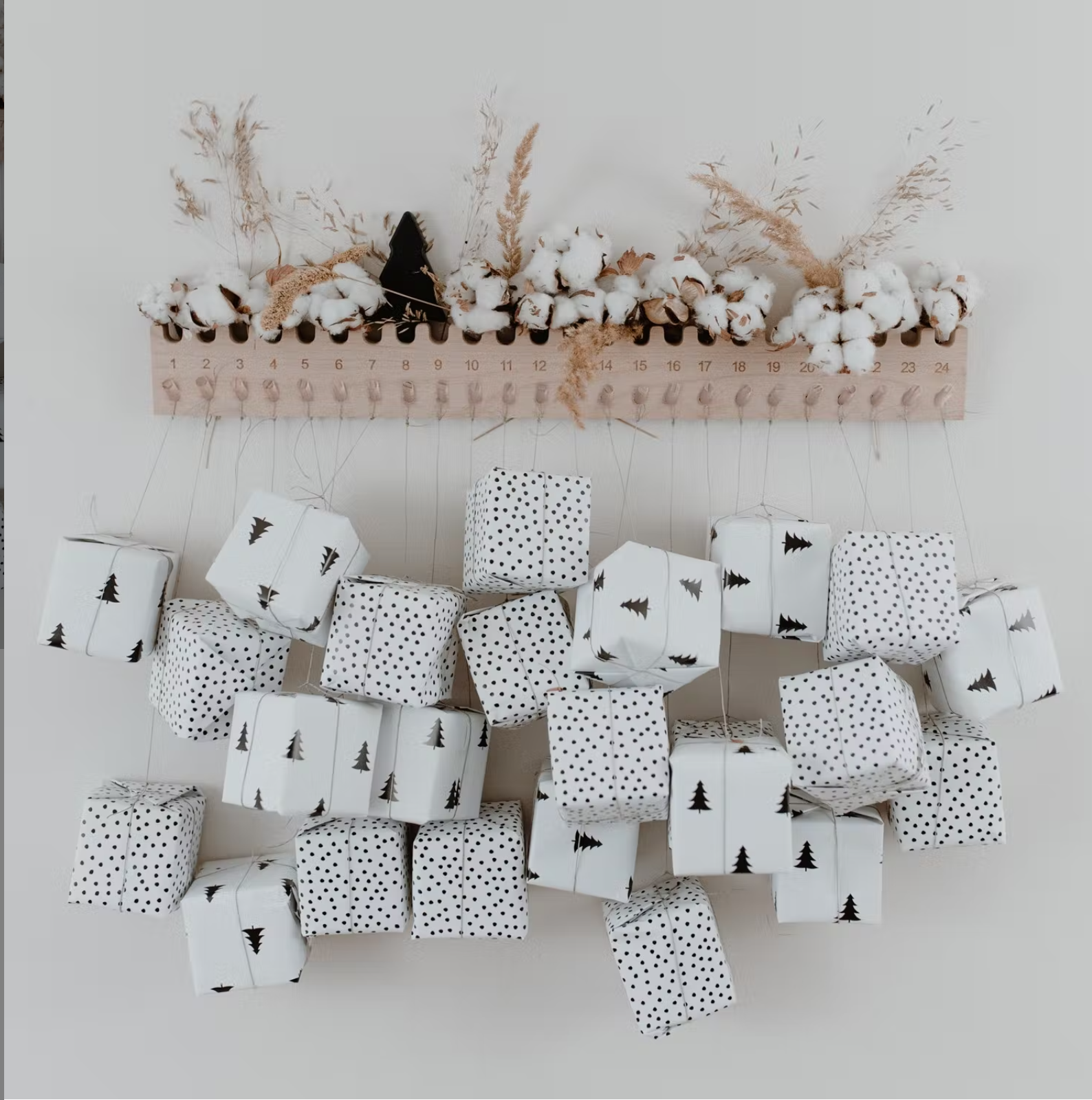 In order to be able to attach the wooden strip well to the wall, we have prefabricated 2 holes on the sides on the back. The advent calendar is particularly beautiful when you decorate a chain of lights or a Christmas branch between the bar and the wall. To do this, you shouldn't attach the wooden strip too tightly to the wall.