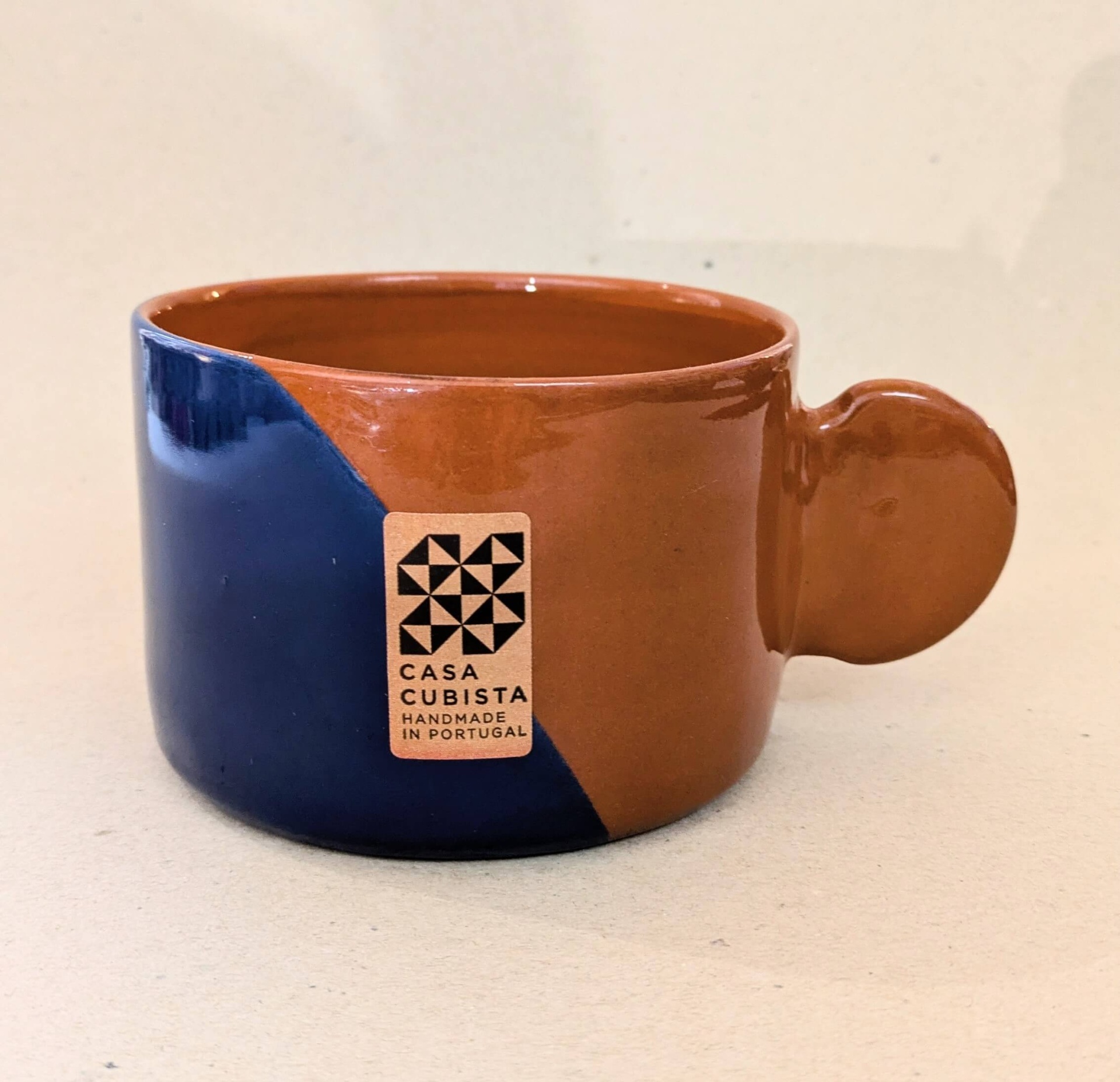 • Caneca cerâmica azul escura e castanha com etiqueta CASA CUBISTA