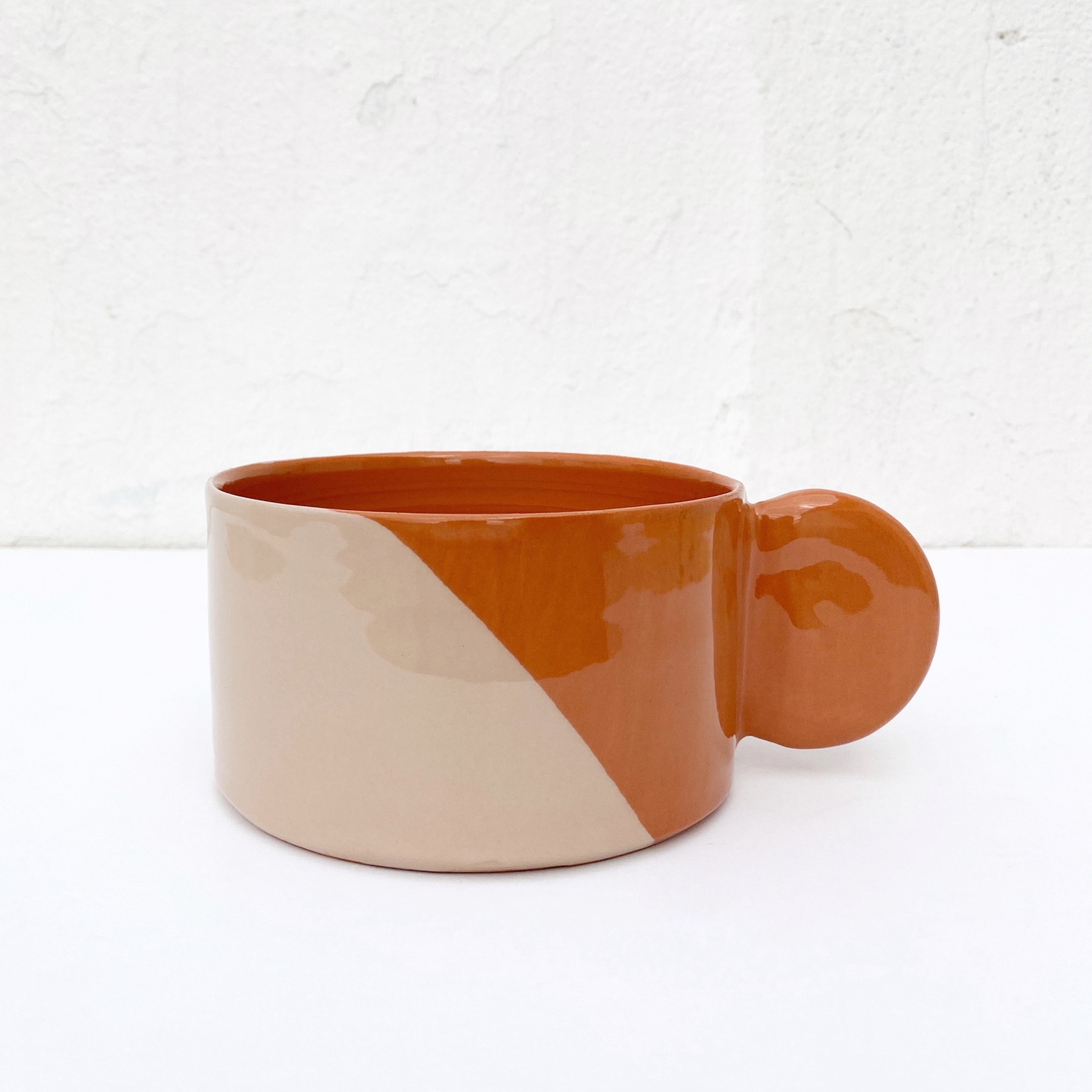 • Copo de cerâmica bicolor com pega circular na lateral