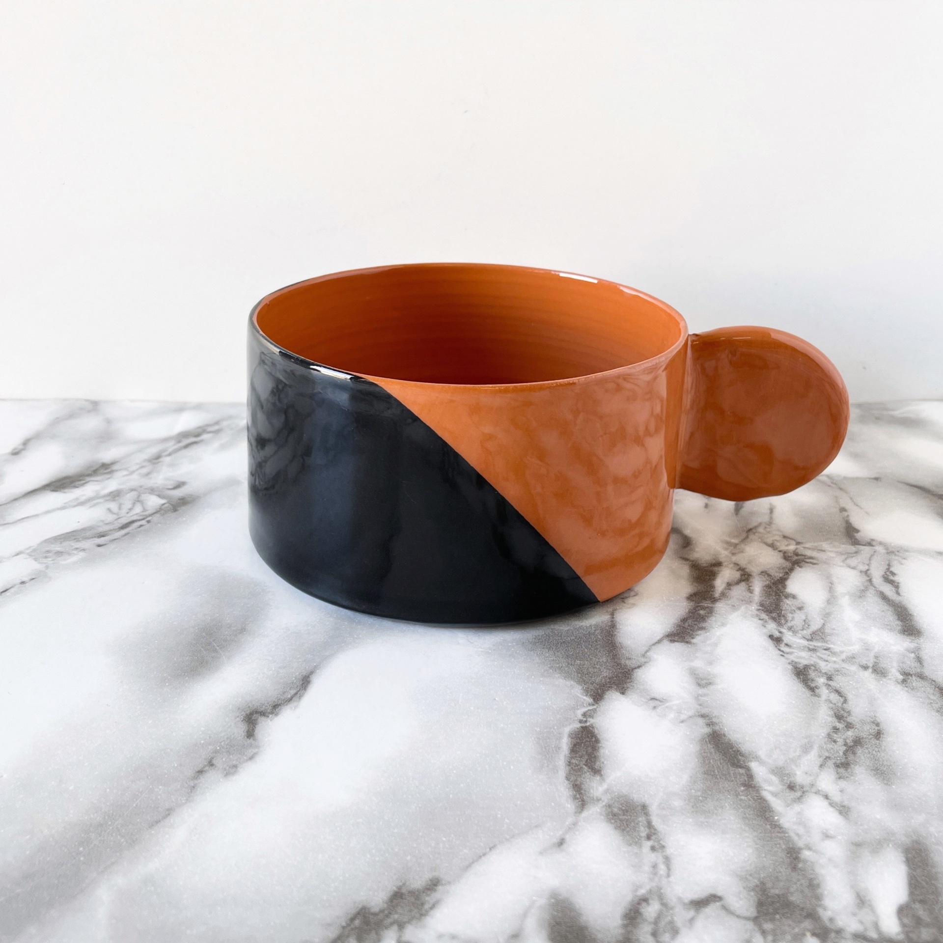 Caneca bicolor de cerâmica com pega redonda sobre superfície de mármore.