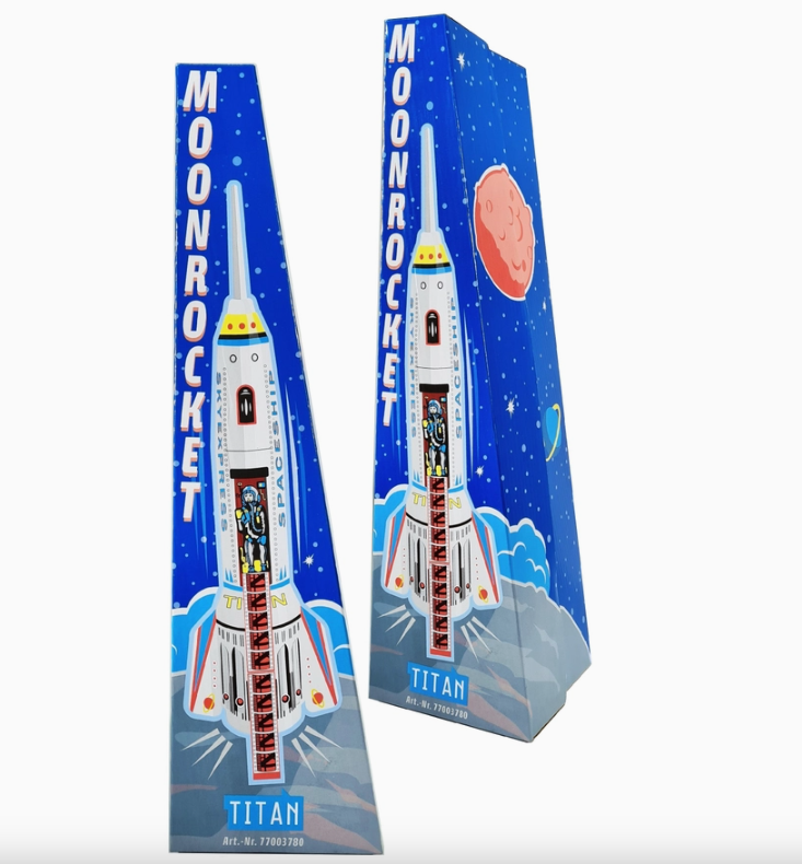 Para as estrelas com “Titan”! O foguete clássico remasterizado num design branco. Juntamente com os seus irmãos “Aurum” e “Radon”, “Titan” apresenta-se em cores fortes. Tanto o foguete em si como as novas embalagens de alta qualidade chamam a atenção. O foguete tem um acionamento de fricção, se o empurrarem nas rodas e o deixarem conduzir na frente de um obstáculo, endireita-se e a escada cai, revelando o astronauta.
