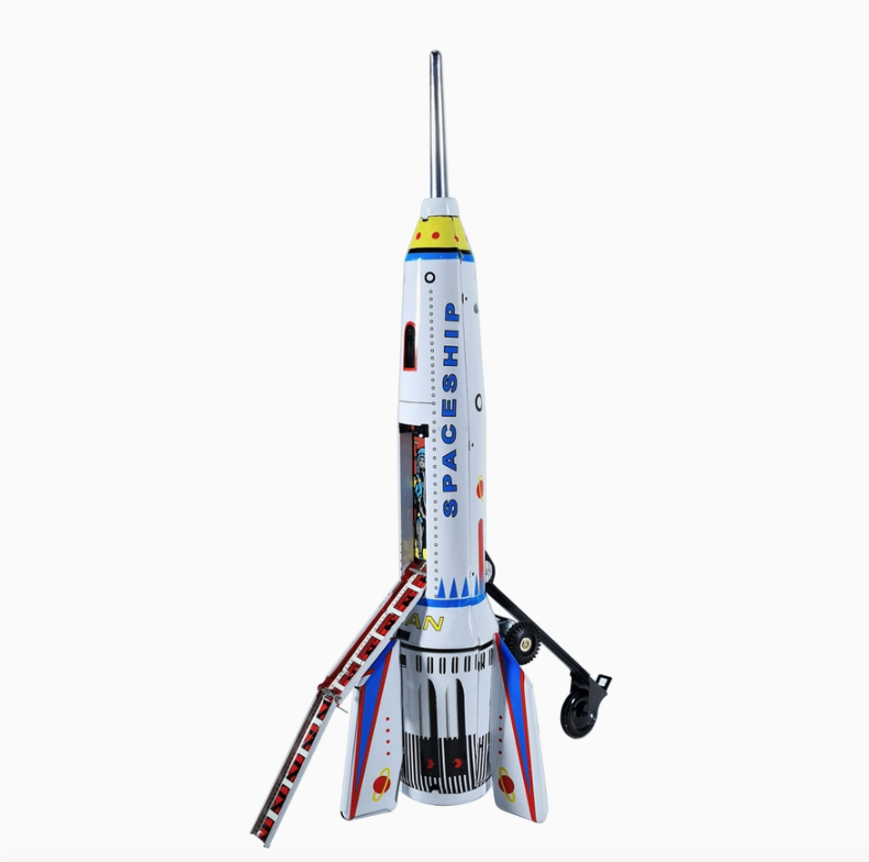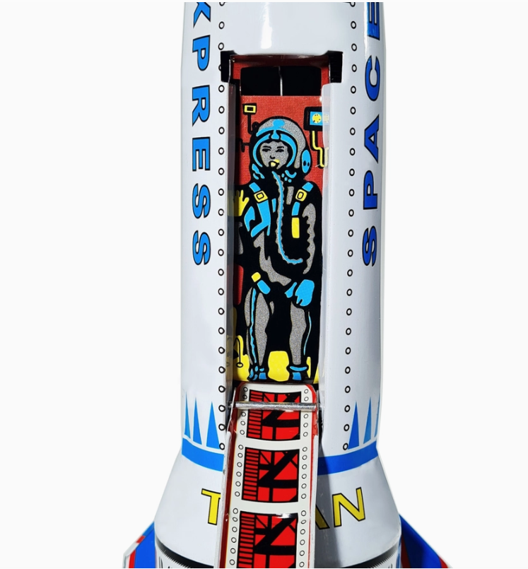 • Brinquedo vintage de metal em forma de foguete com astronauta
