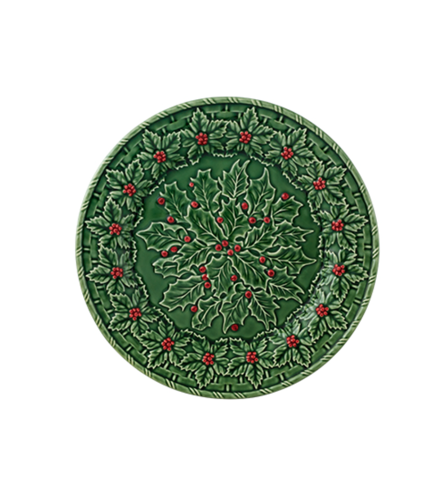 • Prato cerâmico verde com decoração de folhas e bagas vermelhas