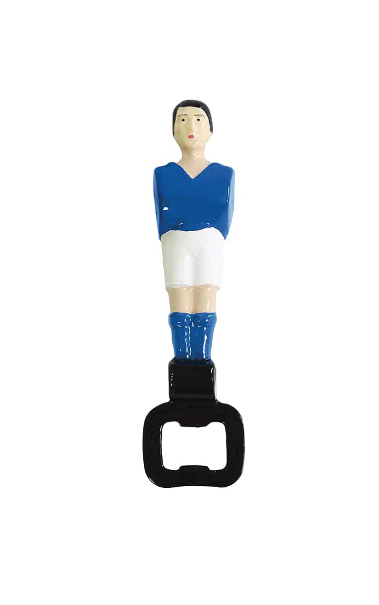 • Abridor de garrafas jogador de futebol com camisola azul e calções brancos