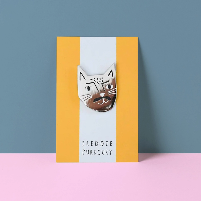 The ‘Freddie Purrcury’ pin is a feline interpretation of music legend, Freddie Mercury now reimagined as ‘Purrcury.’ Whether you're treating yourself or searching for the purr-fect gift for a fellow cat lover or artist, this art-themed cat pin badge is guaranteed to bring a smile to anyone's face. It's a small but meaningful way to express your love for the feline world and the magical realm of art.