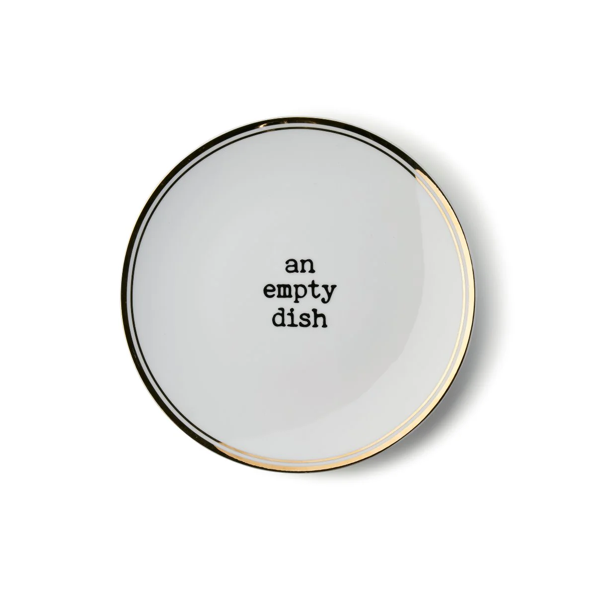 Prato branco redondo com borda dourada e frase 'an empty dish' no centro