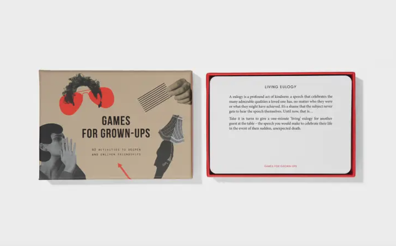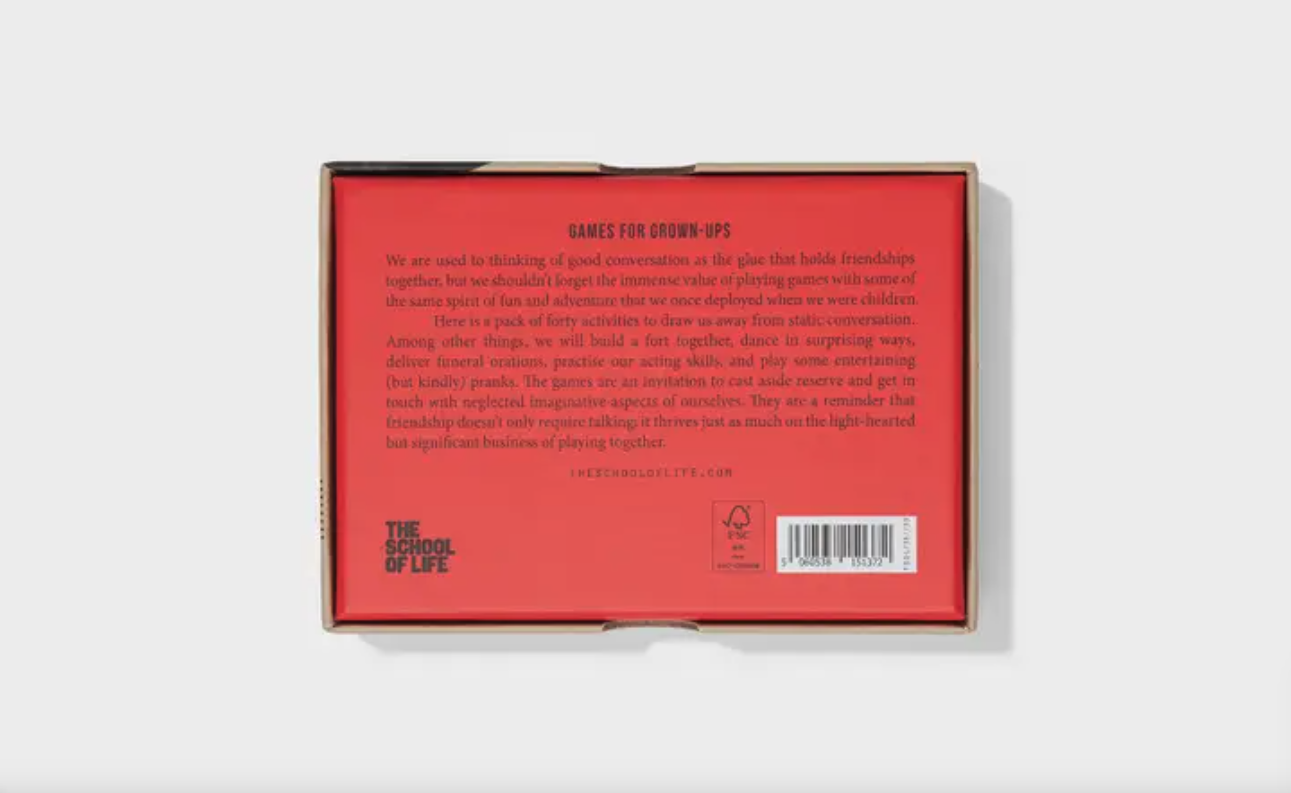 40 activities to draw us away from static conversation and cast aside reserve to get in touch with the neglected imaginative aspects of ourselves. We are used to thinking of good conversation as the glue that holds friendships together, but we shouldn’t forget the immense value of playing games, with some of the same spirit of fun and adventure that we once deployed when we were children.