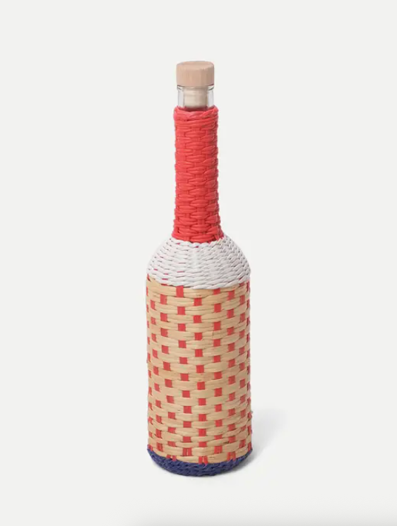 Cada garrafa é entrançada à mão com tiras de vime natural e fios coloridos. O resultado é uma garrafa funcional e única, que se integra como elemento decorativo, concebida tanto para conter líquidos como para acrescentar personalidade a qualquer ambiente.