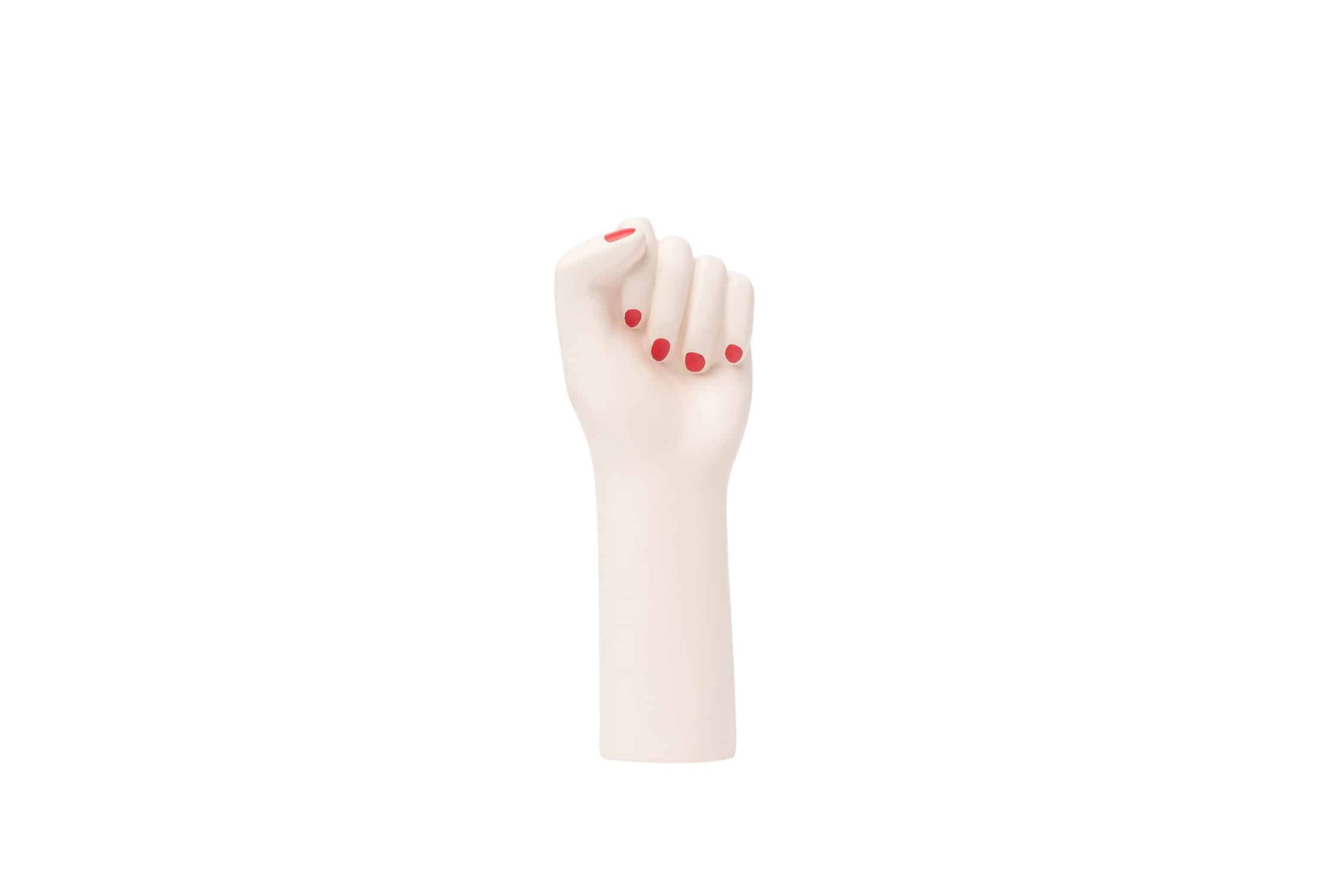 Modern ceramic vase with matt finishing shaped as a fighting womans hand, with painted red nails. A symbol of resilience, bravery and strenght.