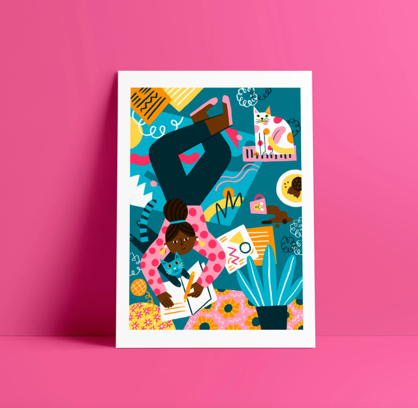 • Poster ilustrado de pessoa a escrever com gato e plantas ao redor