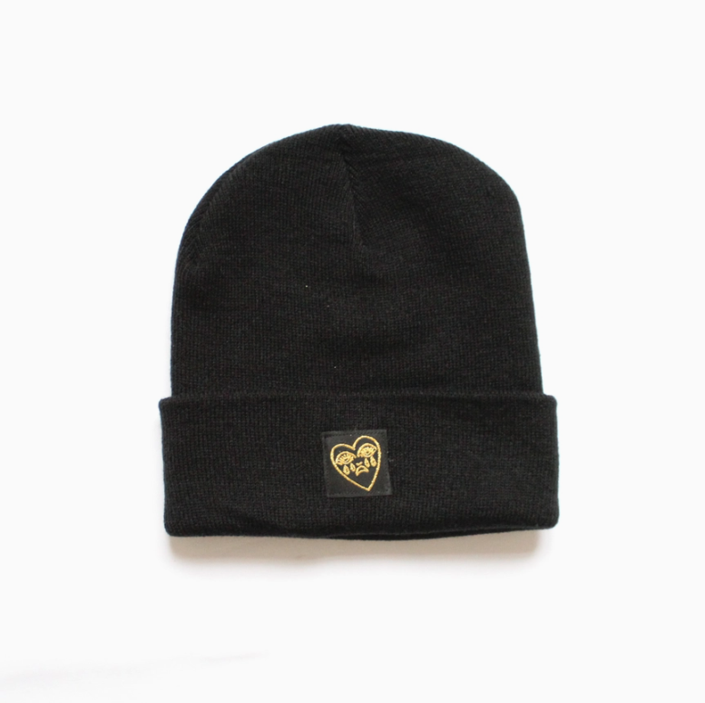 • Gorro preto de malha com emblema dourado em forma de coração