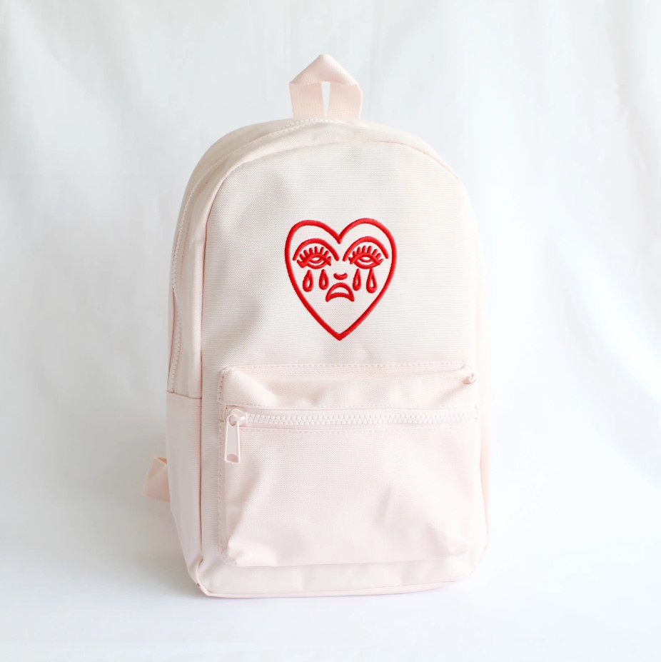 • Mochila rosa claro com bordado vermelho de coração triste e lágrimas