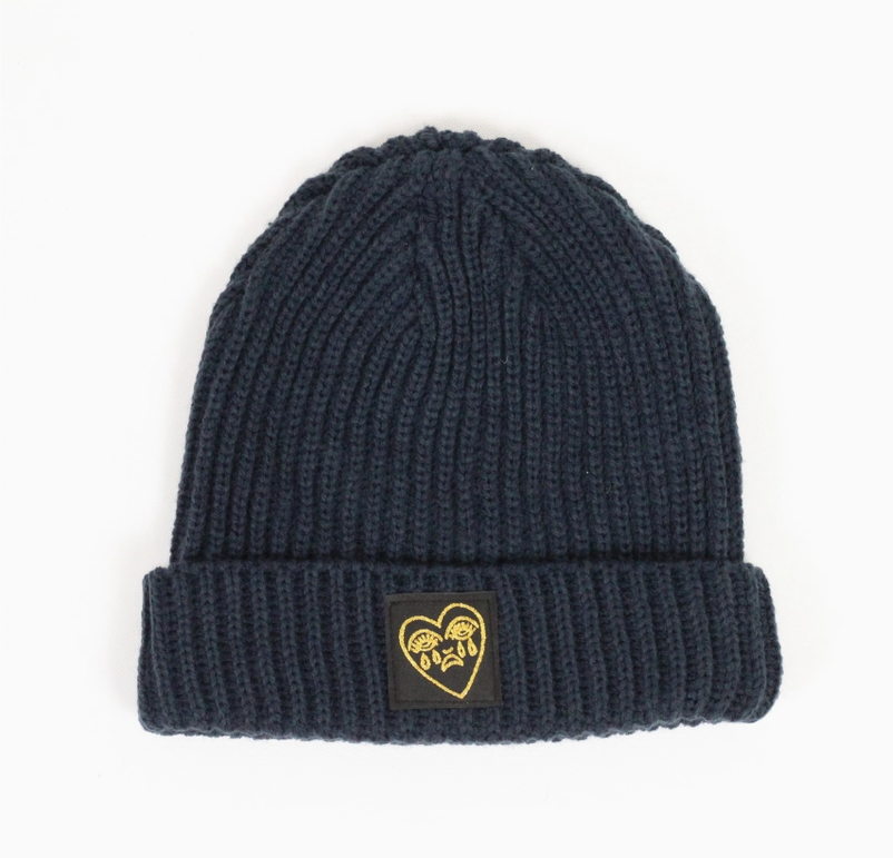 • Gorro de malha azul escuro com emblema de coração amarelo e rosas