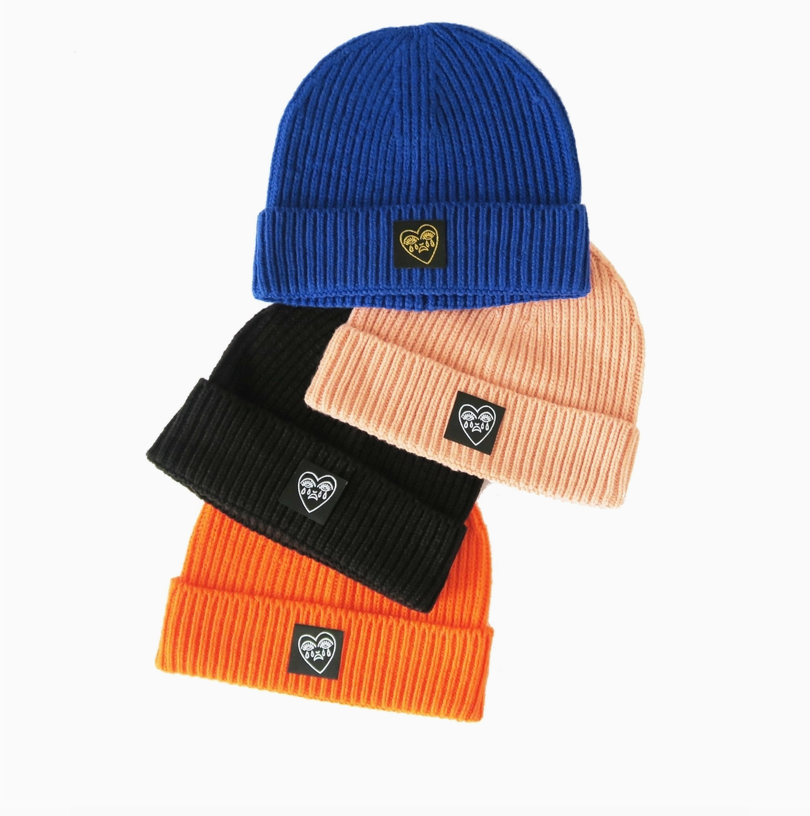 • Quatro gorros de malha com etiqueta preta e coração branco