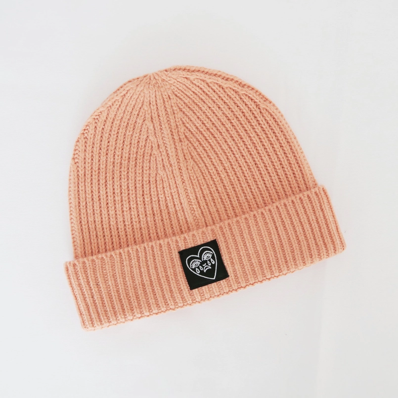 • Gorro de malha cor de salmão com etiqueta preta e coração branco na dobra