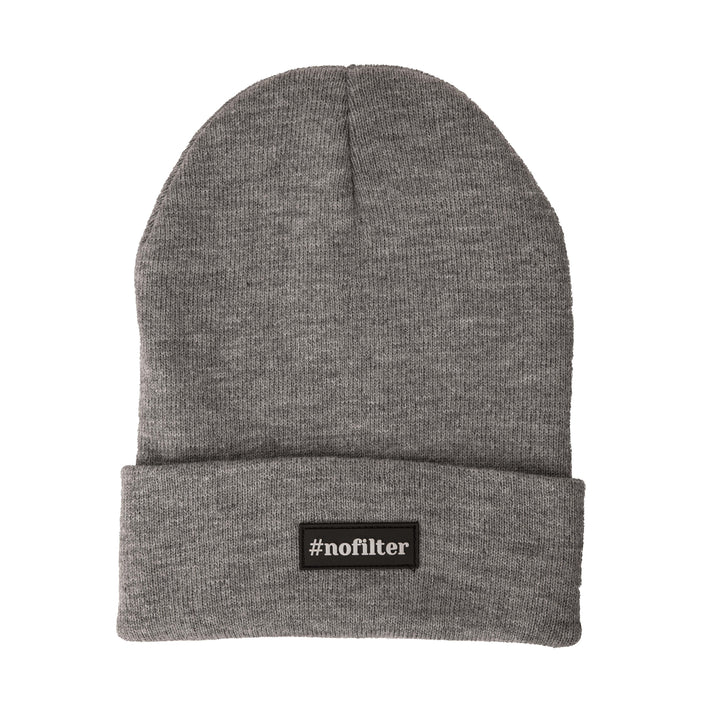 Gorro cinzento de malha com etiqueta '#nofilter'