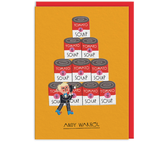 Ilustração colorida com latas de sopa de tomate e figura caricata em cartão amarelo com borda vermelha