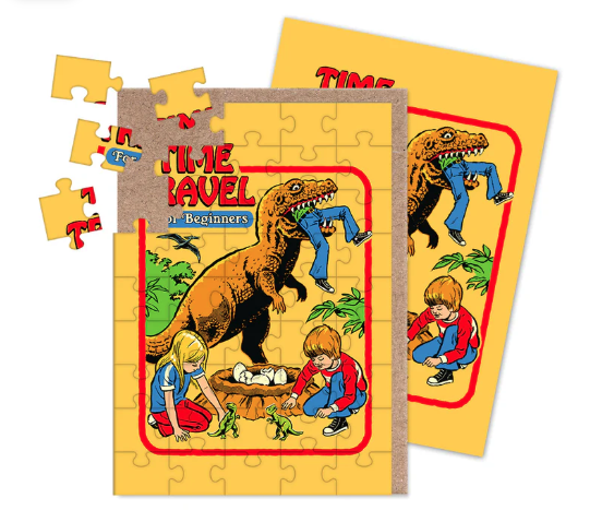 • Puzzle de cartolina com capa amarela de livro infantil TIME TRAVEL For Beginners e ilustrações de dinossauros e crianças