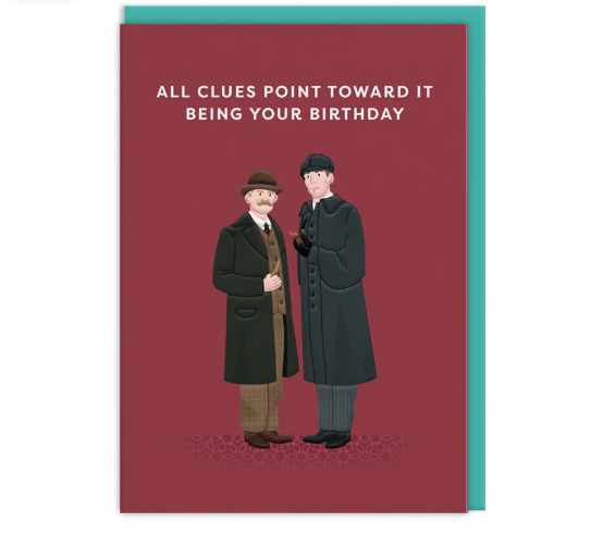 Cartão de aniversário com ilustração de dois homens detetives e texto em inglês.