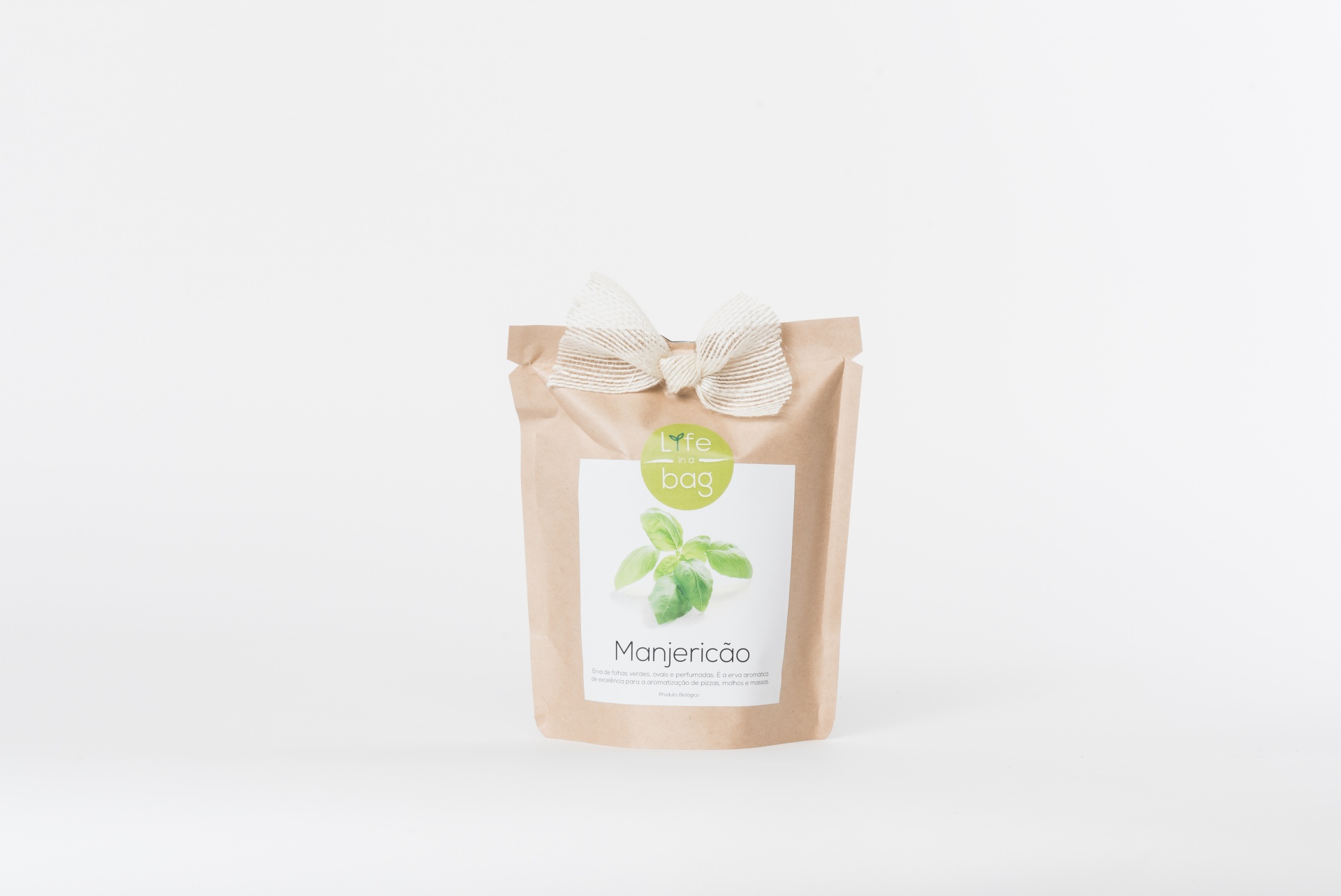 • Pacote de papel com manjericão e laço branco