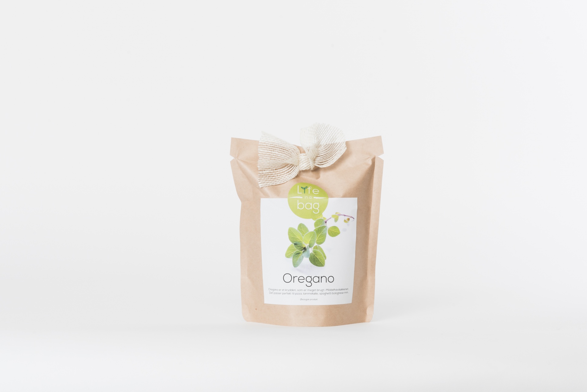• Embalagem de orégano em papel castanho com etiqueta e fita branca