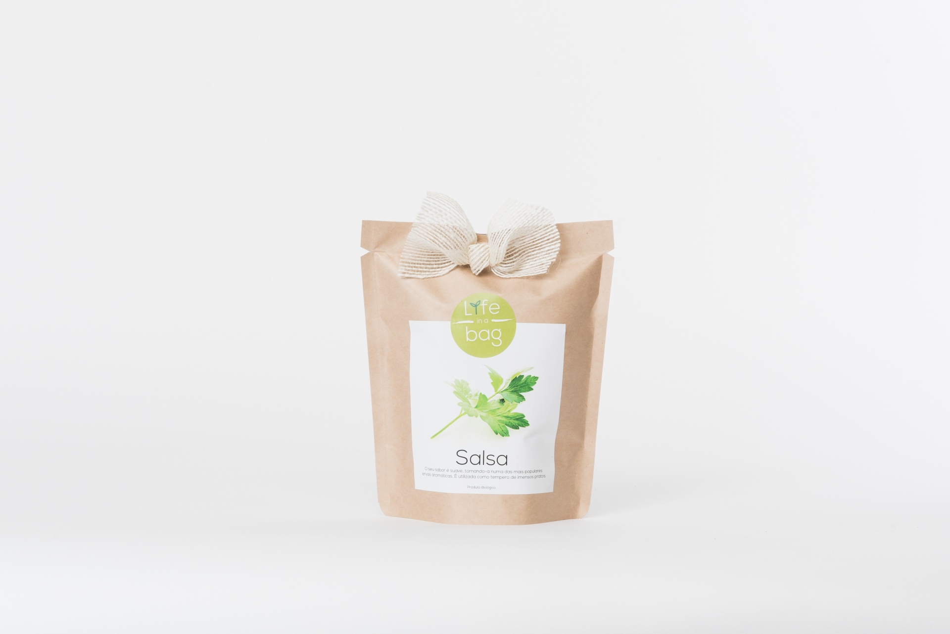 • Saqueta de papel castanho com salsa, rótulo branco e laço de tecido bege