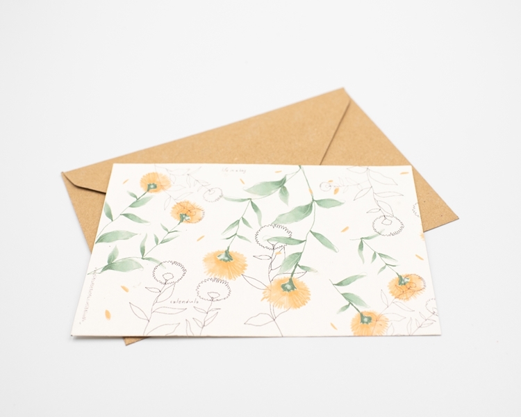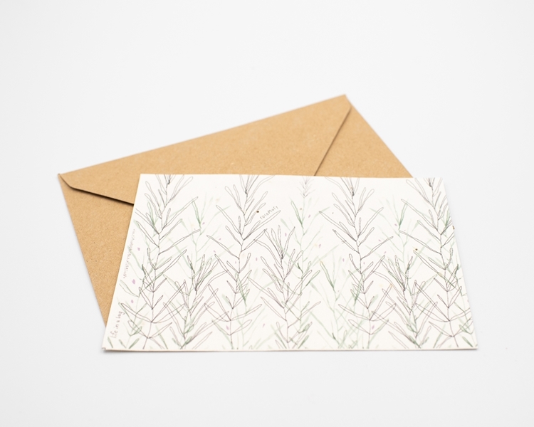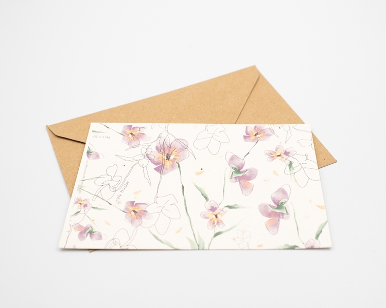 Conteúdo Um postal para semear 10x15 cm com uma ilustração da Violeta Cor de Rosa e um envelope em papel kraft.
