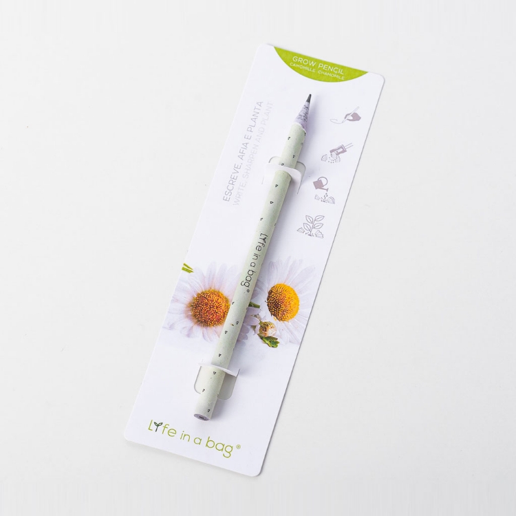 Um lápis feito a partir de papel reciclado com sementes de camomila no interior. Escrever nunca foi tão inspirador. Escreve, afia e planta as aparas em vez de as deitares fora, e vais ver crescer lindas flores de camomila. Quanto mais escrever…mais Vida irá crescer!