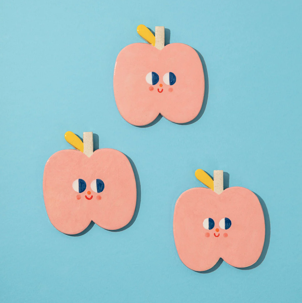 • Imãs decorativos em forma de maçã cor-de-rosa com rosto sorridente