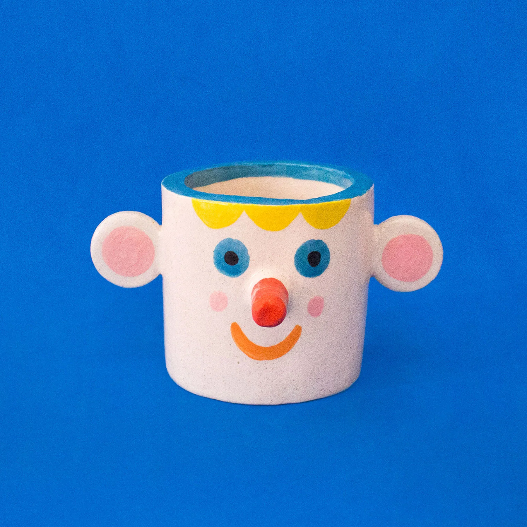 Caneca de cerâmica decorada com rosto sorridente em fundo azul