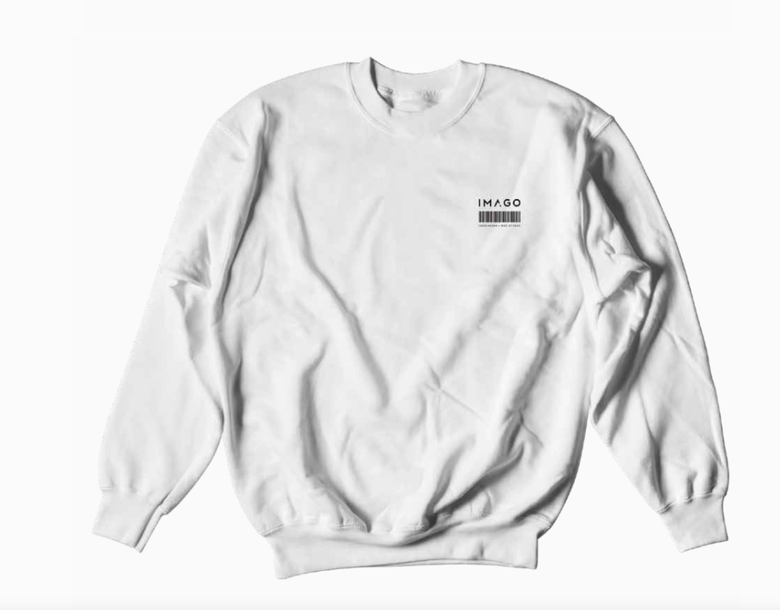 • sweatshirt branca de manga comprida com texto IMAGO e código de barras no peito
