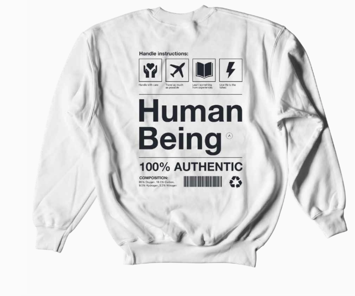 • Sweatshirt branca com texto e ícones pretos com instruções e descrição 'Human Being 100% Authentic'