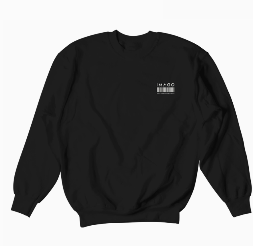 Sweatshirt preta com texto IMAGO e código de barras na frente