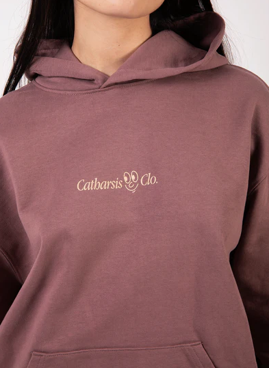 • Sweatshirt castanha com capuz, bolso canguru e texto Catharsis Clo. estampado ao centro