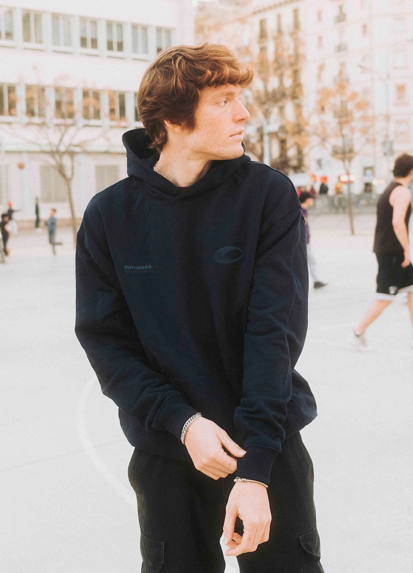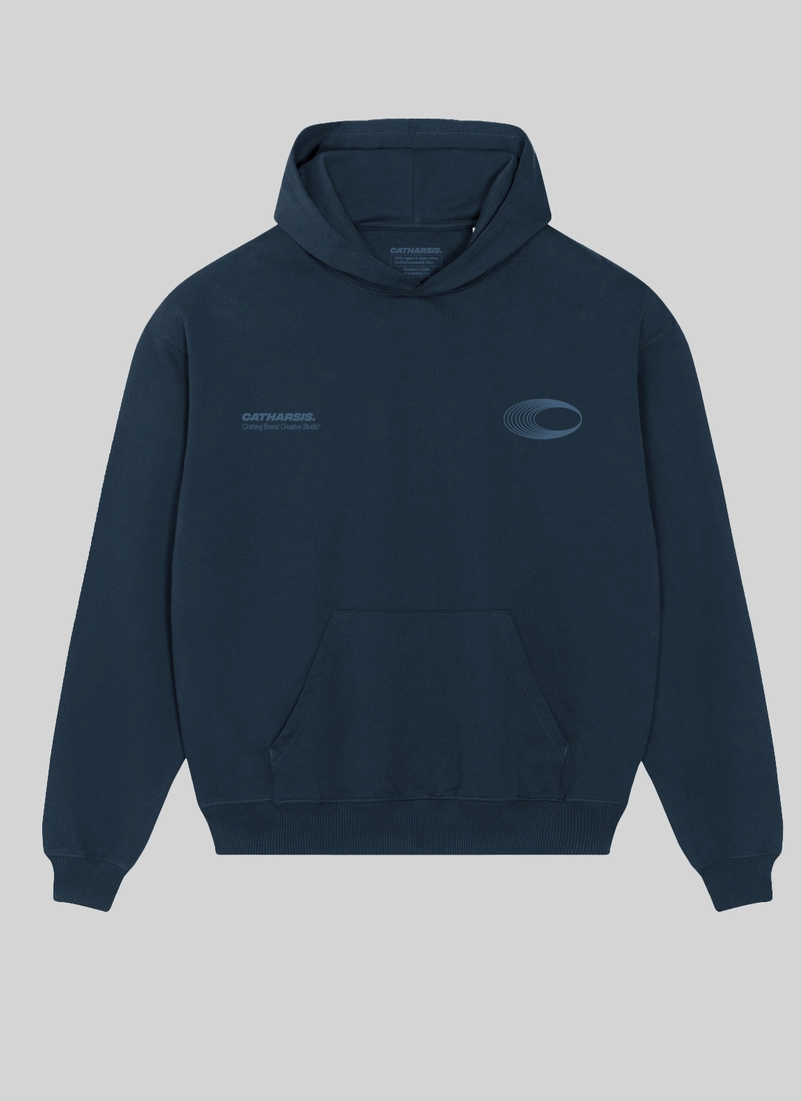 • Hoodie azul escuro com capuz e bolso canguru, detalhes de texto e logo no peito