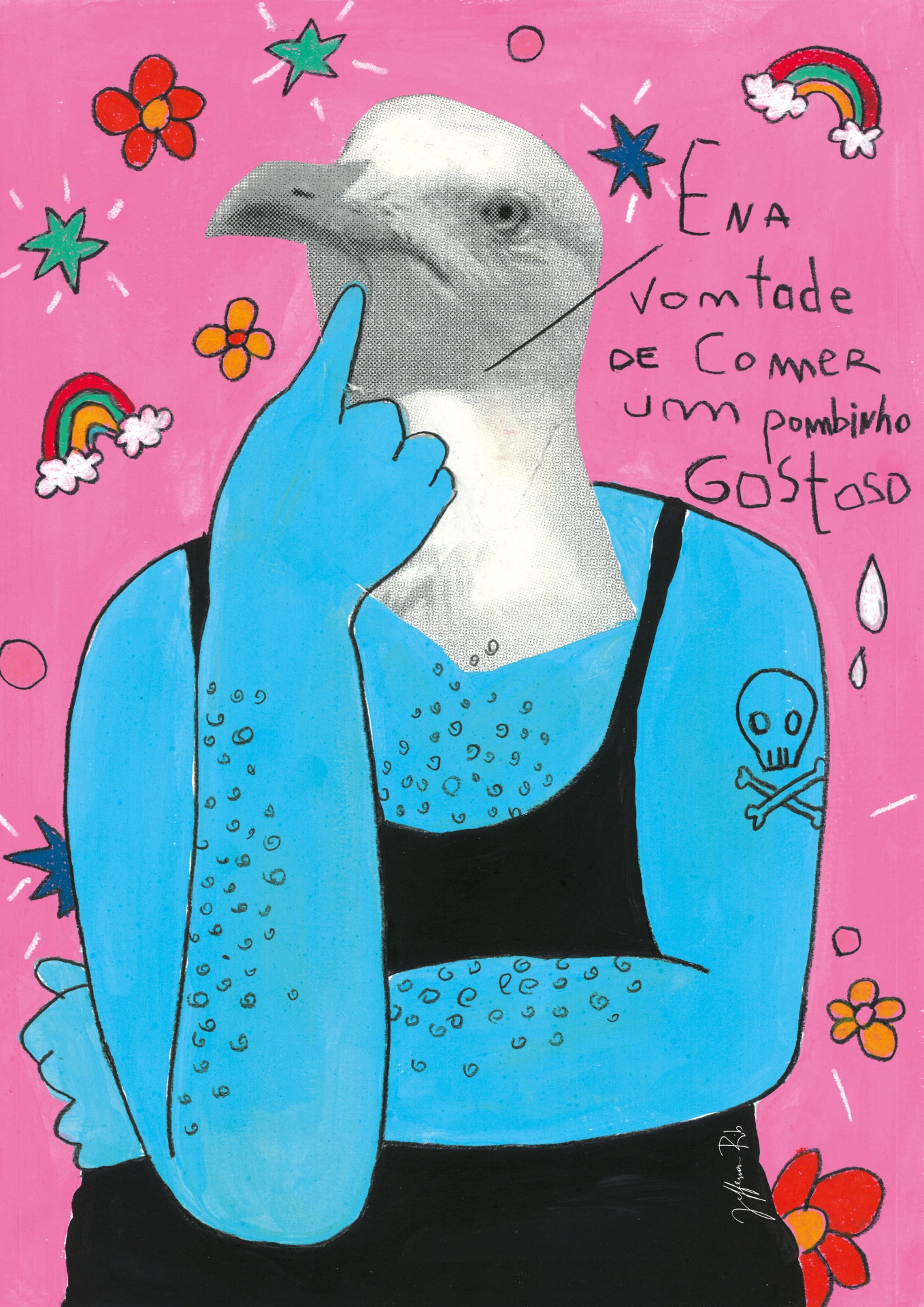 Ilustração de figura com corpo azul e cabeça de pombo, fundo rosa com flores e arco-íris