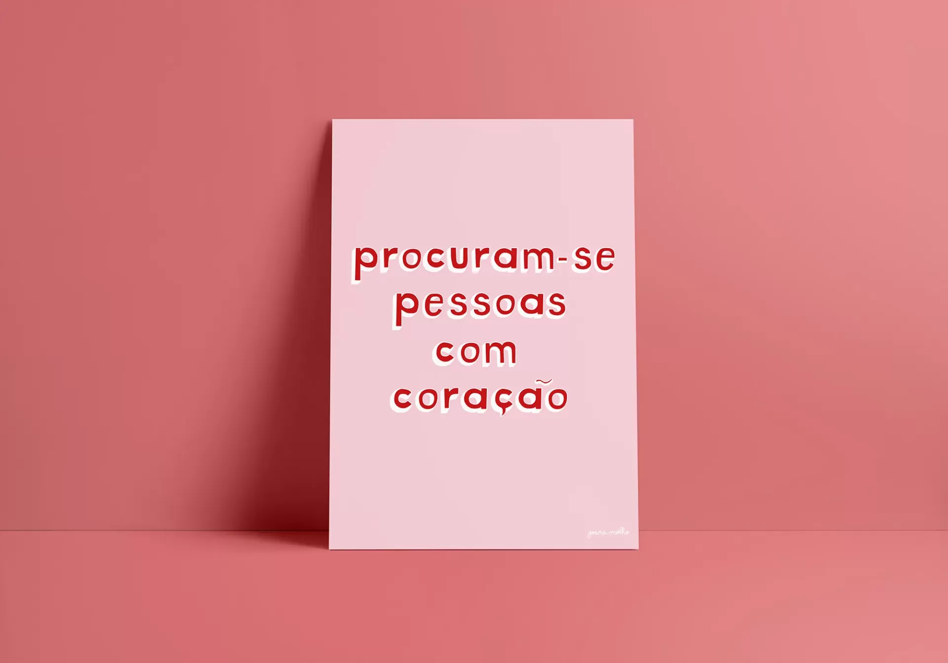 • Cartaz cor-de-rosa com texto em vermelho 'procuram-se pessoas com coração'