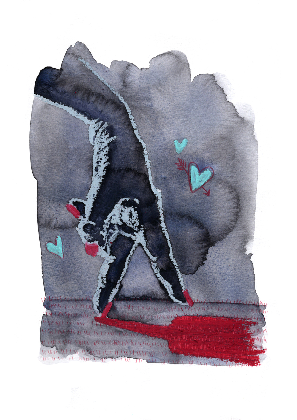 Ilustração em aquarela de pessoa em posição invertida com roupa preta e detalhes vermelhos, fundo cinza com corações azuis
