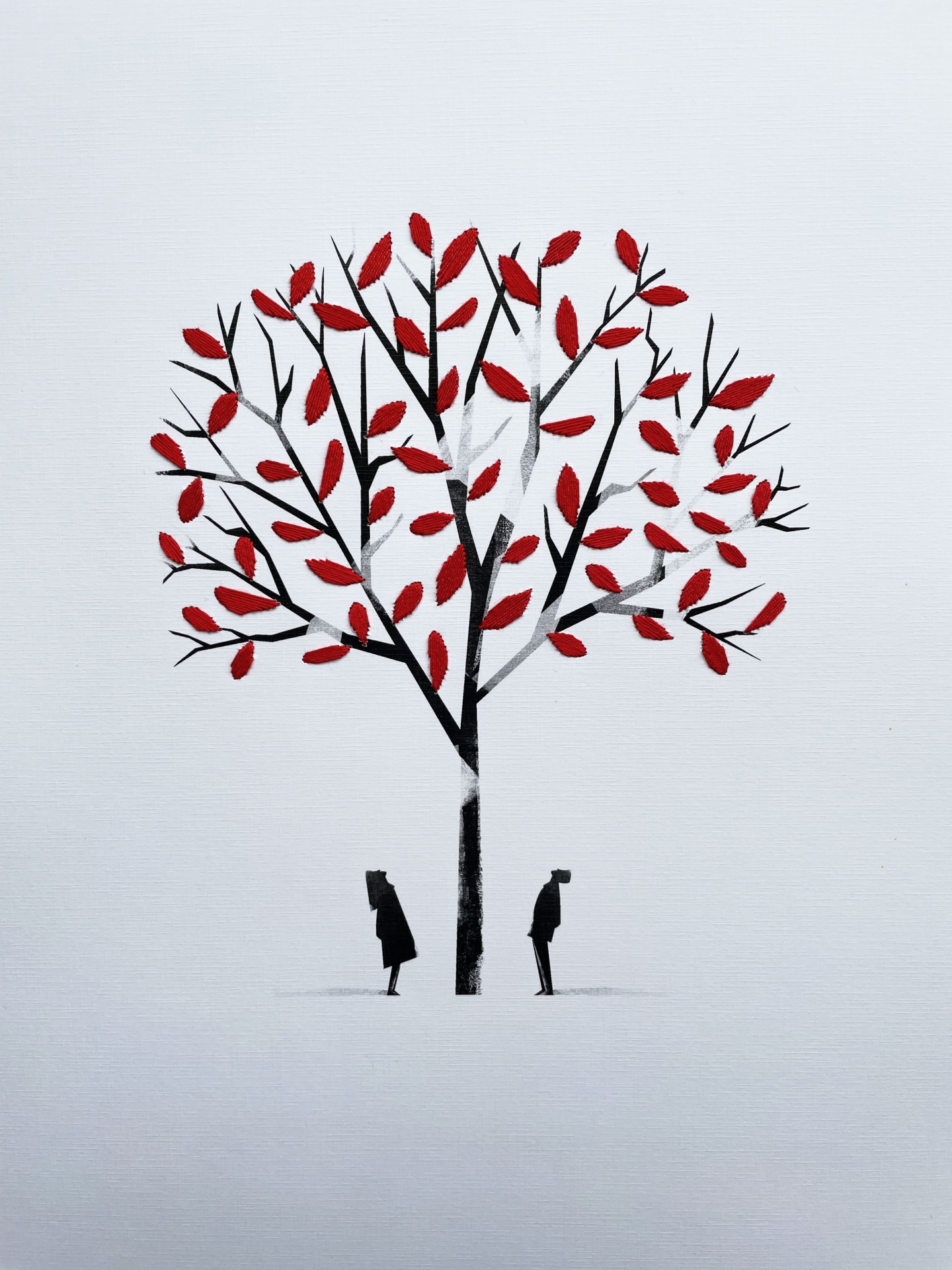 • Quadro minimalista de árvore com folhas vermelhas e duas silhuetas negras opostas