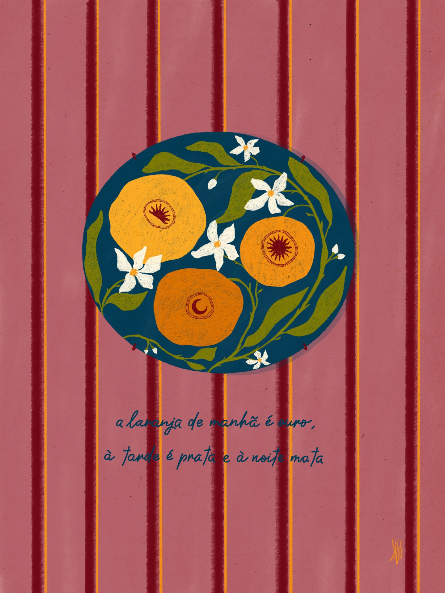 Ilustração de laranjas e flores num prato azul com fundo riscado e texto manuscrito.