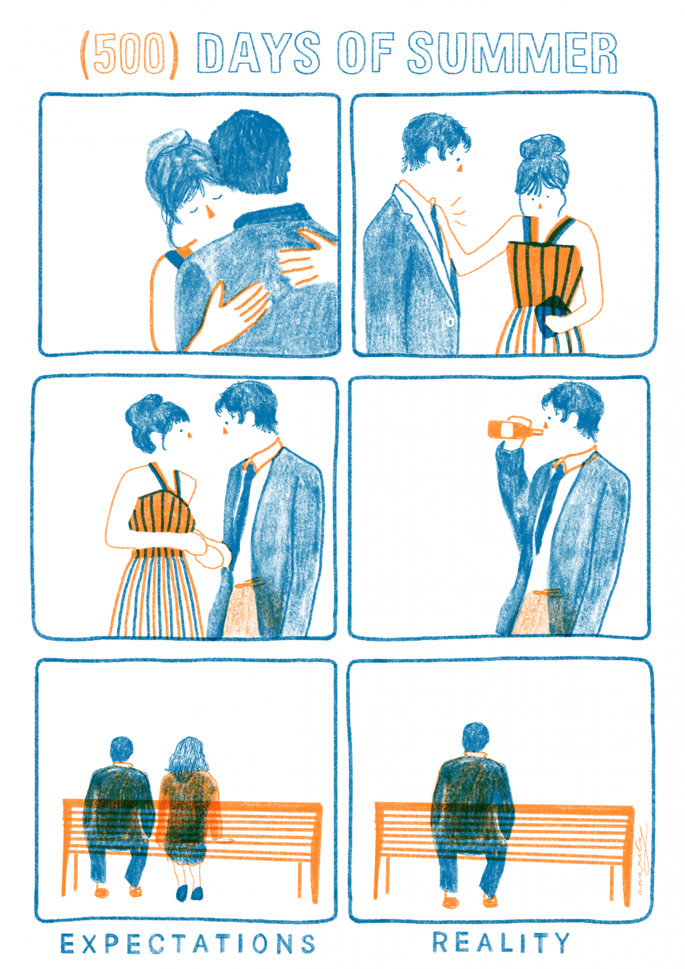 • Ilustração de casal em seis quadros, tema (500) DAYS OF SUMMER, com Expectativas e Realidade.