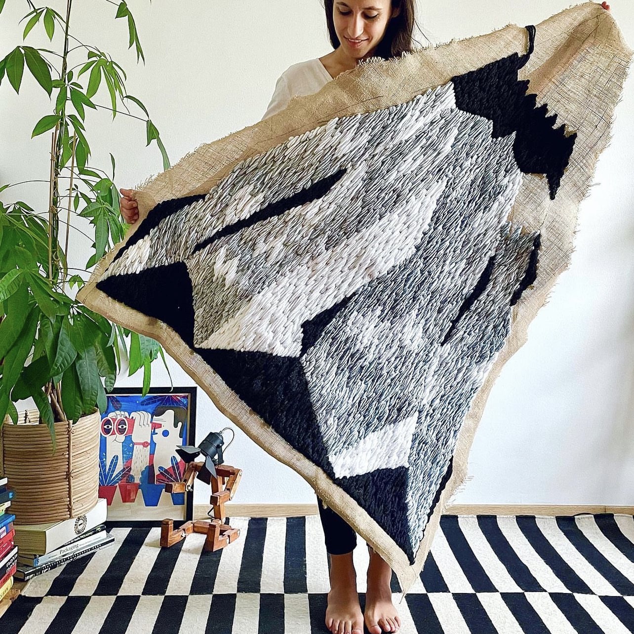 • Tapete triangular cinza e preto com padrão geométrico segurado por mulher