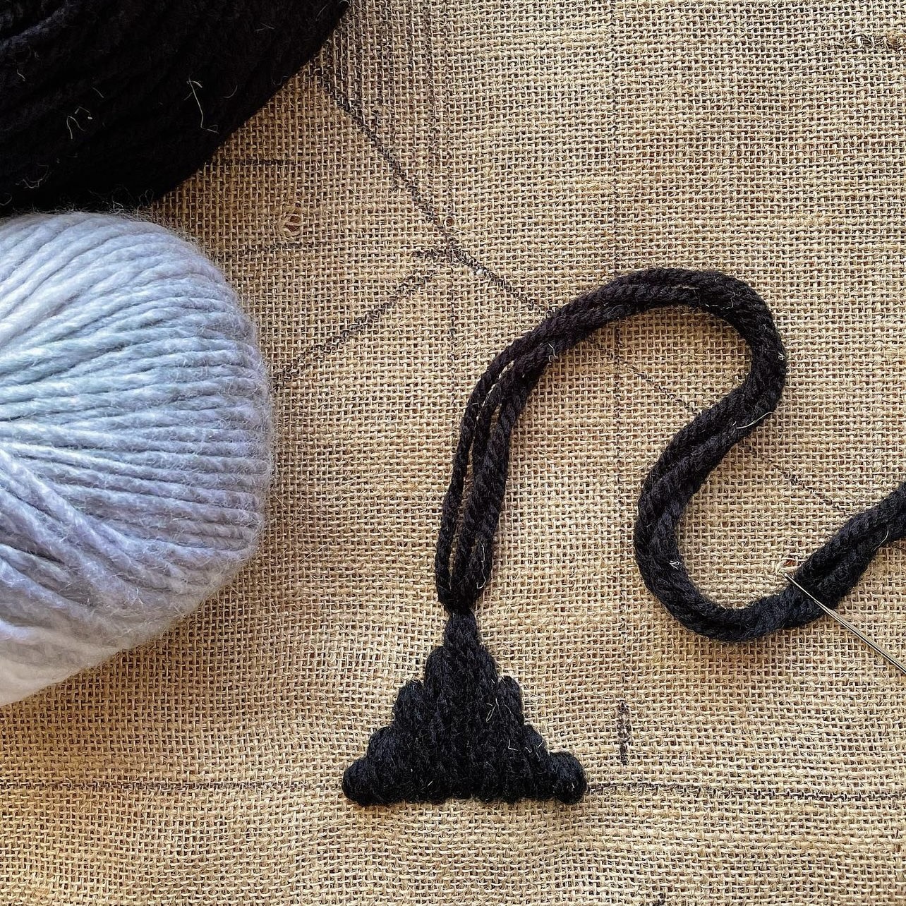 • Novelo de lã cinza claro e fio preto trançado em forma triangular sobre tecido bege.