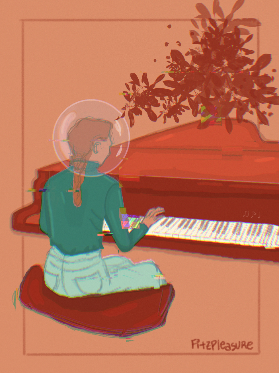• Pessoa a tocar piano de cauda com planta em cima, almofada vermelha e fundo laranja